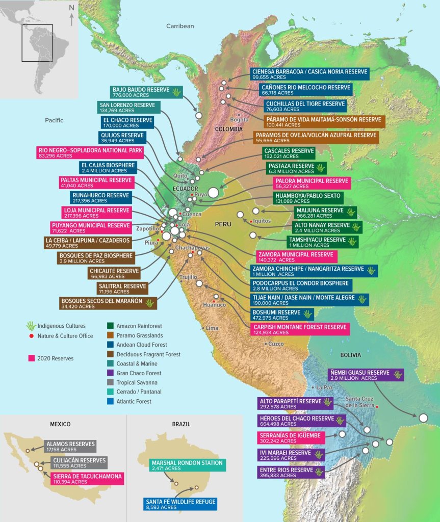 The combined land mass that has been conserved in Ecuador, Peru, Bolivia, Brazil, Colombia and Mexico equates to about 33,000 square miles, or a combined land mass that is more than three times larger than Massachusetts and more than half the size of New York state.8